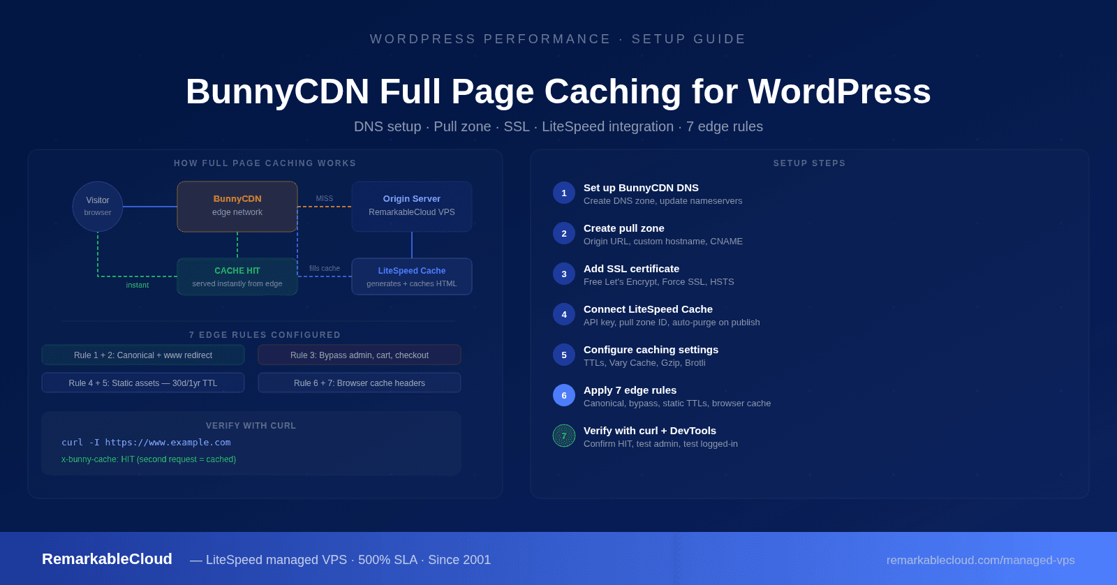 This guide covers the complete setup: DNS zone, pull zone, SSL, LiteSpeed Cache integration, and the 7 edge rules that make full-page caching work correctly without breaking logins, admin access, or dynamic content.